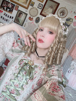 Then in early April it was Helena's birthday. She invited some friends out for Korean BBQ and drinks. I decided to put a nice coord together with my floral AP OP. I also wanted to try this new brown ringlet wig I got from a taobao shop. The sausage curls are perfect, but I don't know if I like the fringe on me, I wish it was a full fringe. Still, it's nice that somewhere other than Maple now offers oldschool appropriate ringlet wigs; something about only one place selling them and Maple not restocking all the colours put me a little on edge lol.