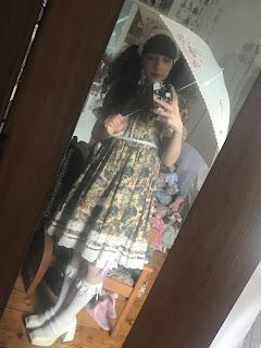 I'm still working through new items, so this time I decided to wear the Heart E skirt I bought, and of course my beautiful new shoes.The skirt was harder to wear than I'd expected though, as it looked weird with my Classical Puppets petticoat, but I worried it looked too deflated with my BTSSB and bodyline pettis. But I went with the latter in the end.